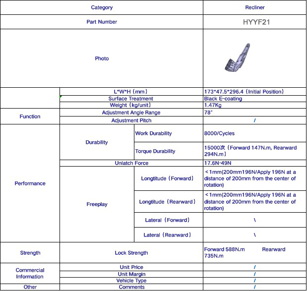 本公司獨立設計開發的產品有:依維柯駕駛座椅滑軌、調角器,并獲得國家專利;雪鐵龍轎車座椅滑軌,并經過法國雪鐵龍的認可;歐曼重型卡車的升降器、減震器;海南馬自達滑軌、江淮旅行車滑軌、英格爾滑軌、調角器、三菱汽車座椅骨架;江淮瑞風商務旋轉機構、滑軌、調角器。